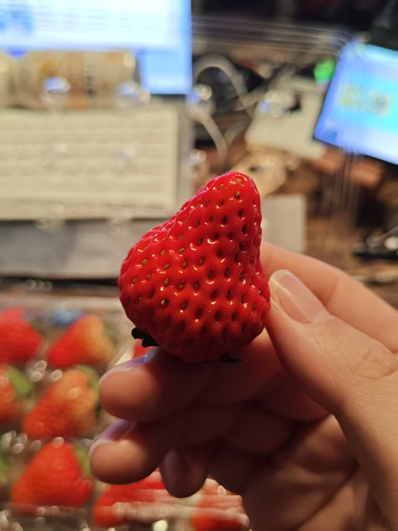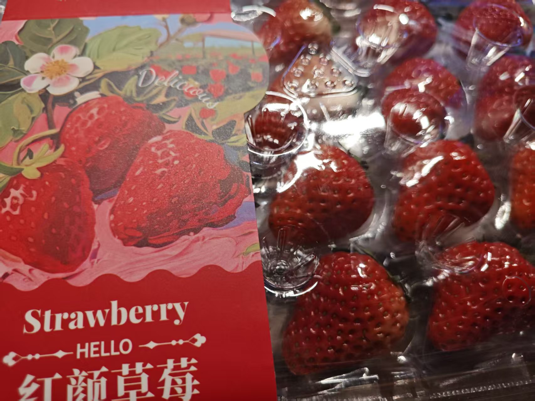 还花了大价钱买到了很漂亮的草莓,我怀着崇高敬的心情,正襟危坐,一口气吃掉了一大半,入口即化!好好吃啊,特别甜,因为它要1盒34.99元!能够感到开心,我觉得还是值得的。